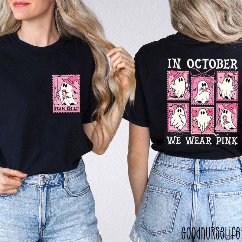Personalized In October We Wear Pink Breast Cancer Ghost Stamps Nurse Two Sided T-Shirt