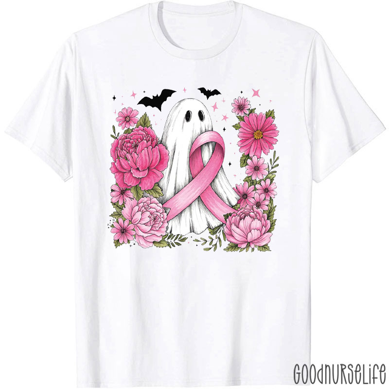 Ghost With Pink Ribbon And Flowers Nurse T-Shirt