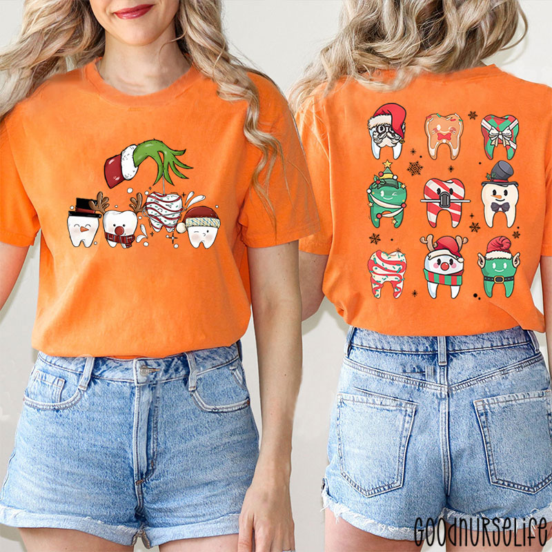 Santa Teeth Green Hand Christmas Dental Two Sided T-Shirt