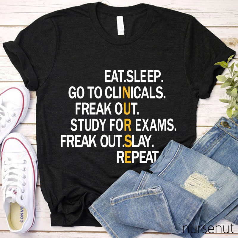 Nurse Means Eat Sleep Clinicals Panic Study Panic Care Plans Repeat Nurse T-Shirt