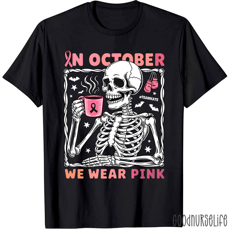 Personalized In October We Wear Pink Breast Cancer Awareness Skeleton Nurse T-Shirt