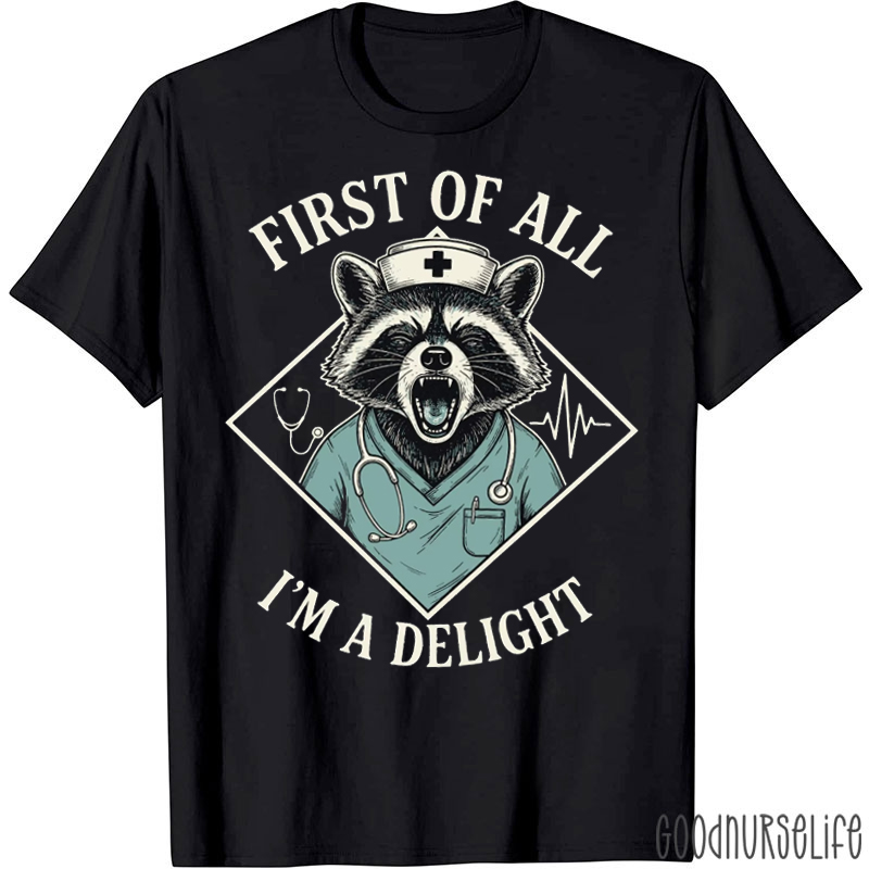 Cute Animal Raccoon First Of All I'm A Delight Nurse T-shirt