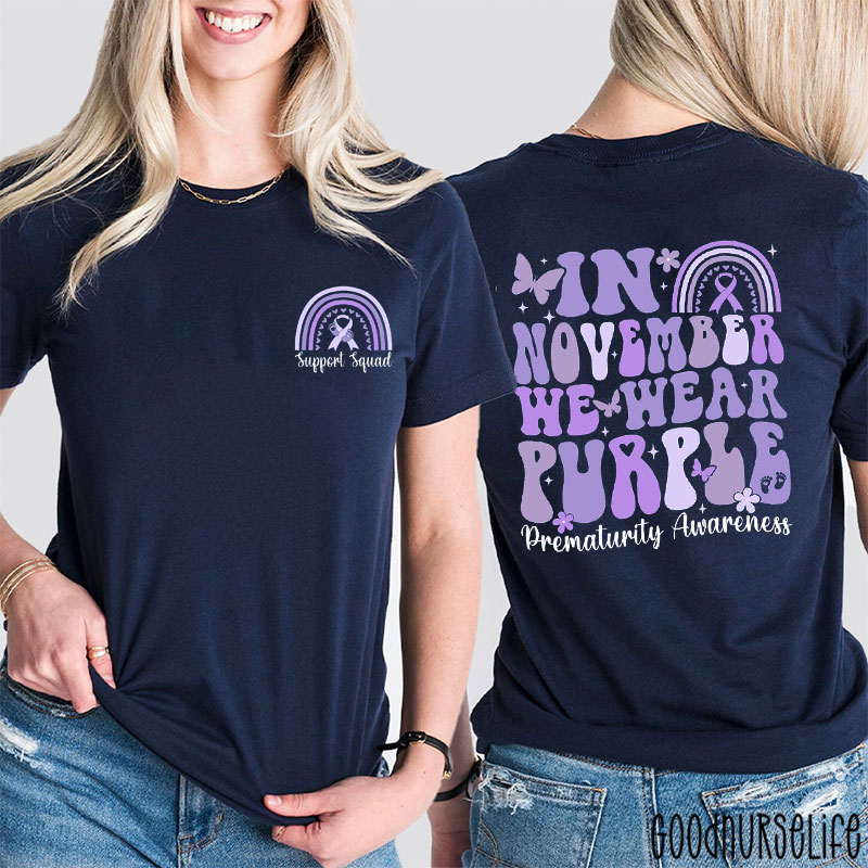 Butterfly In November We Wear Purple Prematurity Awareness Nurse Two Sided T-Shirt