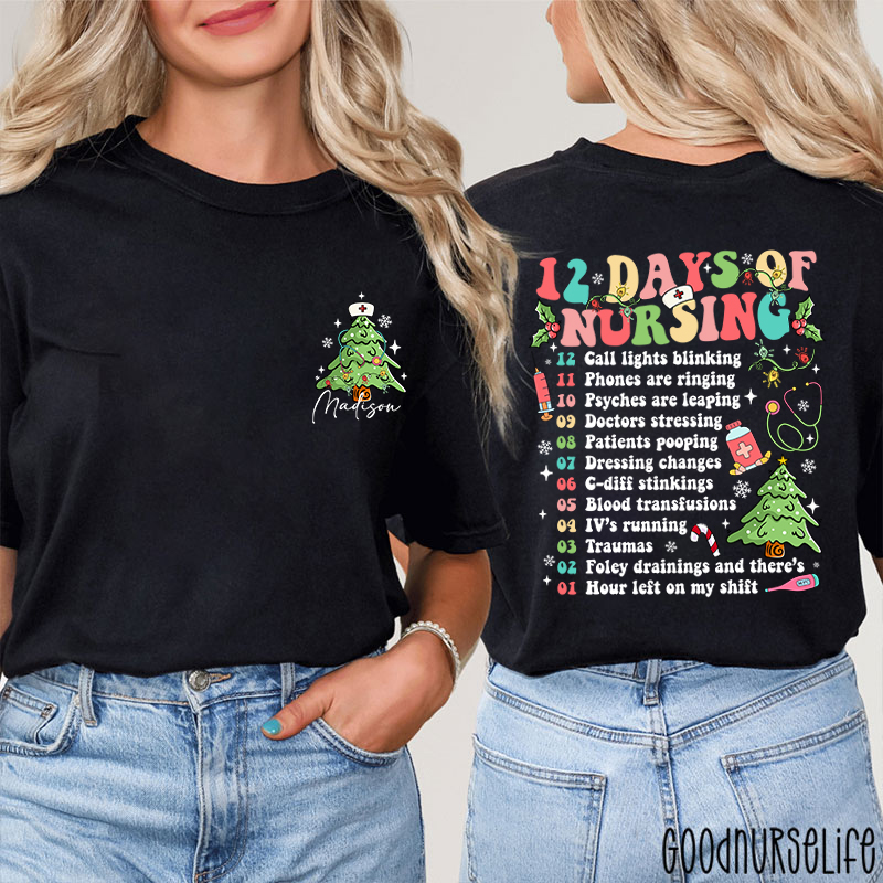 Personalized 12 Days Of Nursing Festive Checklist Nurse Two Sided T-Shirt