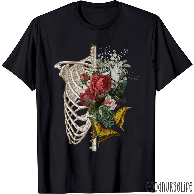 Skeletal Ribcage With Floral And Butterfly Nurse T-Shirt