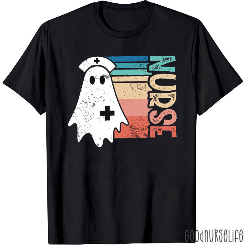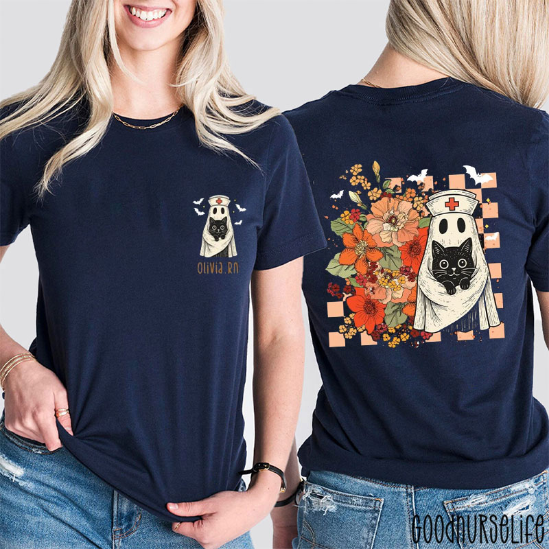 Personalized Halloween Ghost Nurse Cat And Flowers Nurse Two Sided T-Shirt