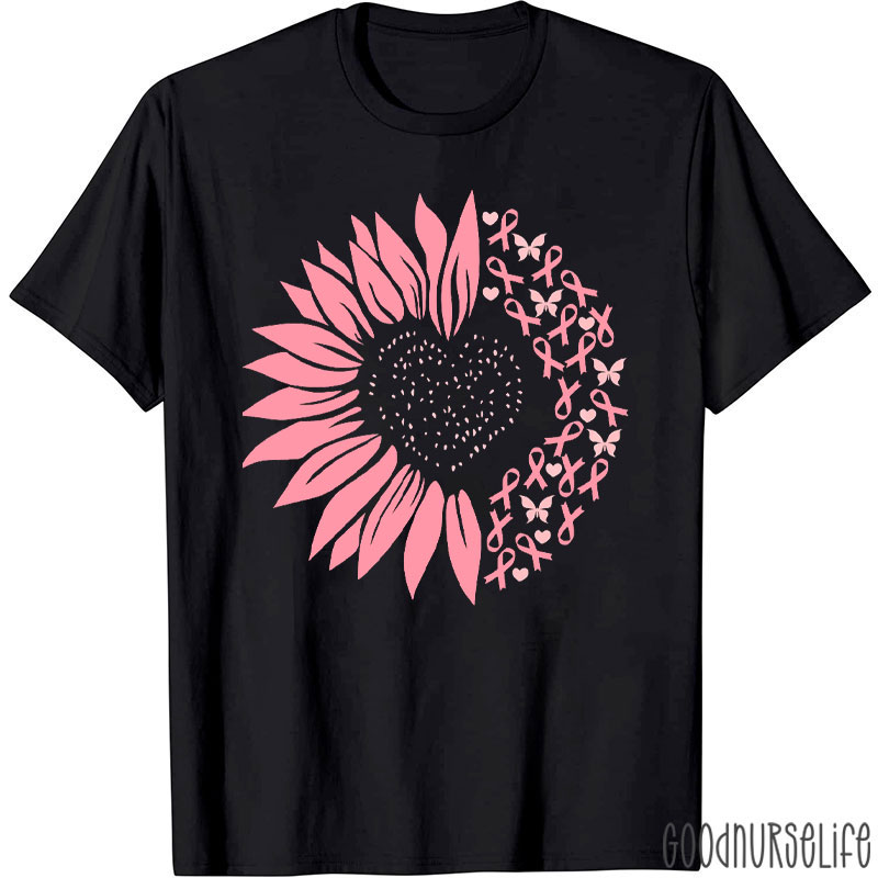 Breast Cancer Awareness Pink Sunflower And Ribbon Heart Nurse T-Shirt