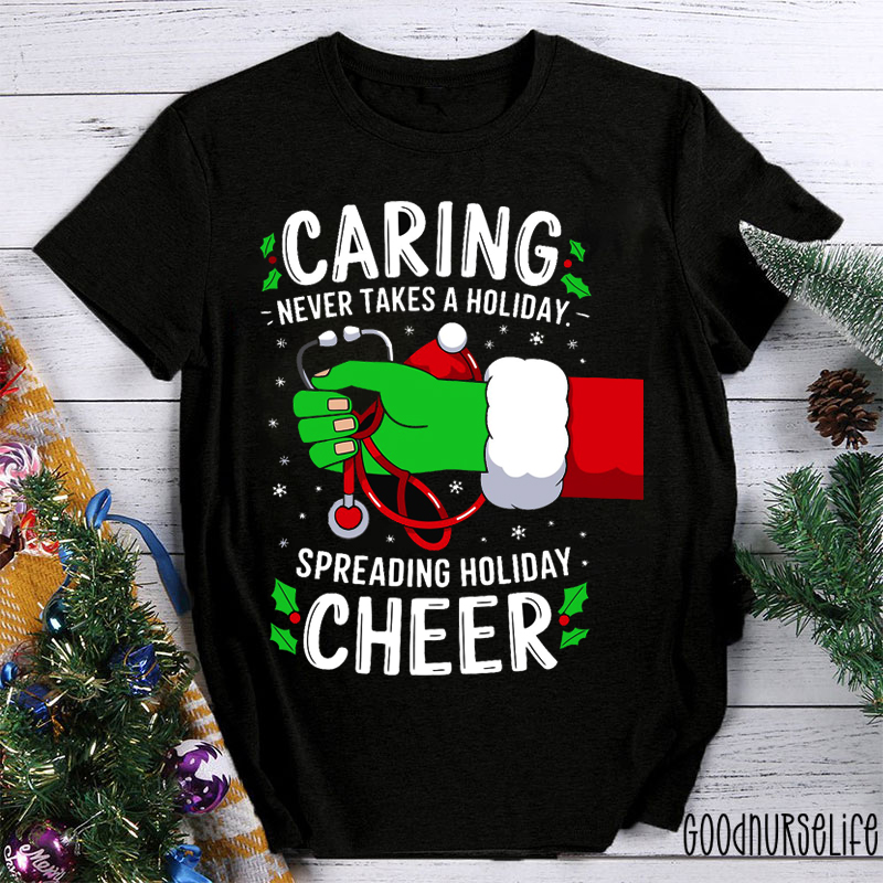 Caring Never Takes A Holiday Spreading Holiday Cheer Christmas Nurse T-Shirt