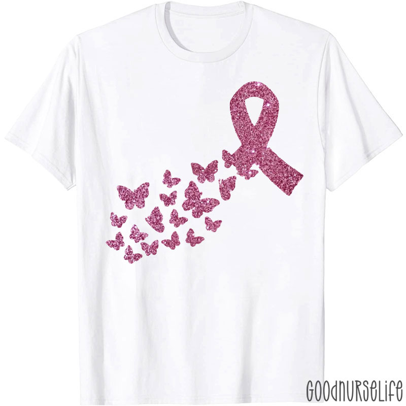 Glitter Pink Hope Cancer Ribbon And Butterflies Nurse T-Shirt