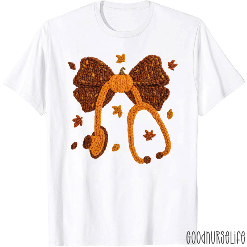 Faux Yarn Knitted Stethoscope Pumpkin Bow Autumn Nurse T-Shirt