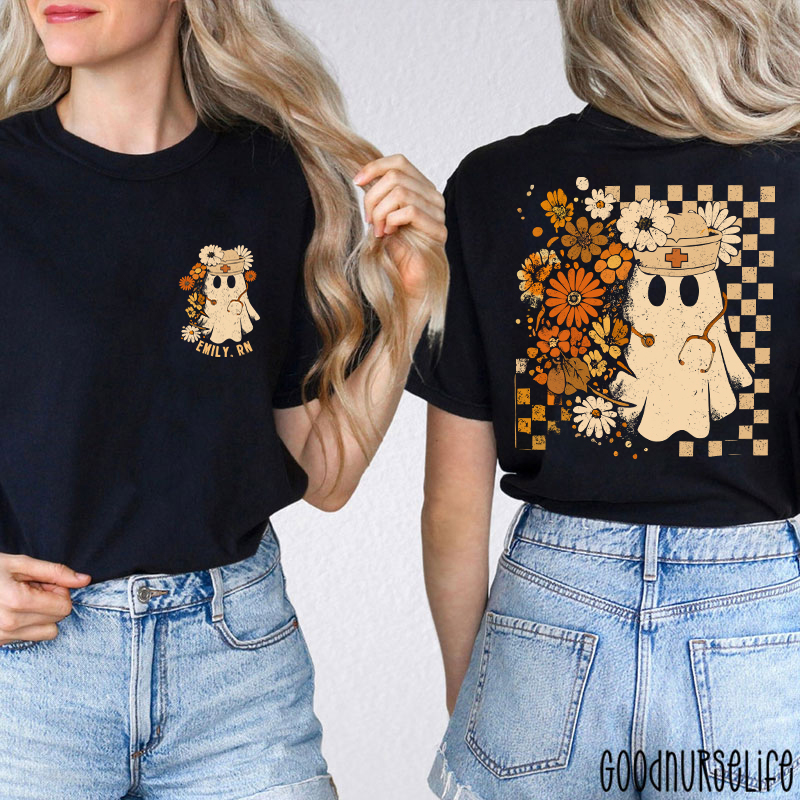 Personalized Checkerboard And Flower Ghost Nurse Two Sided T-Shirt