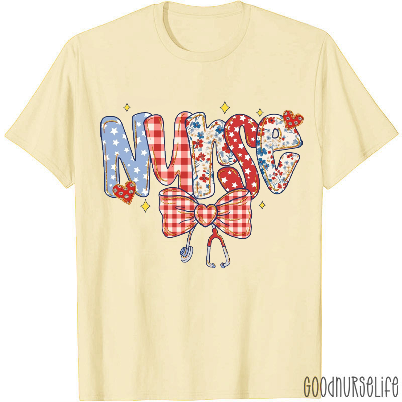 Personalized Red Plaid Bow Patriotic Nurse T-Shirt