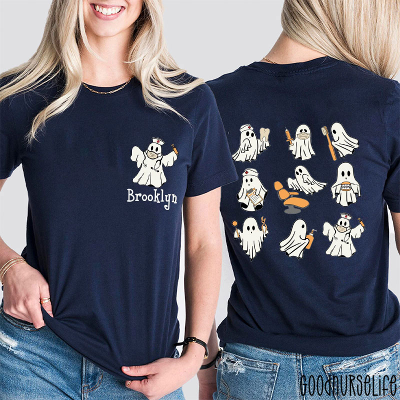 Personalized Ghost Teeth Dentist Care Halloween Two Sided T-Shirt