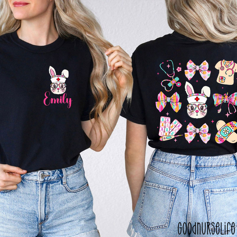 Personalized Name Pink Style Bunny Nurse Two Sided T-Shirt
