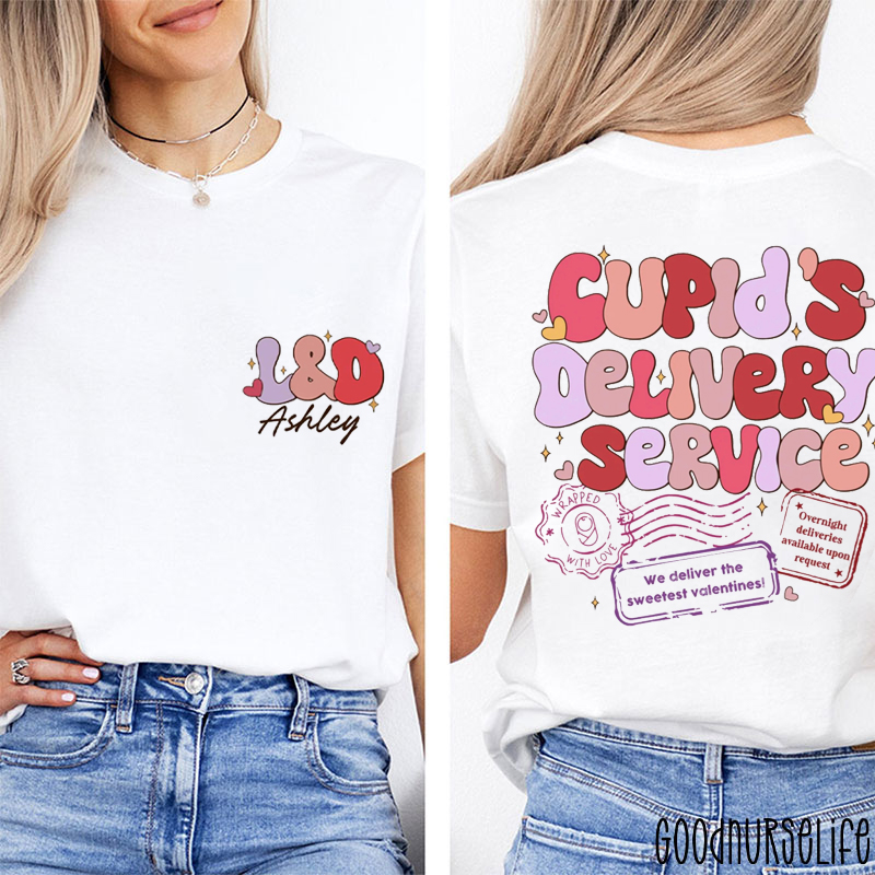 Personalized Cupid's Delivery Service Labor And Delivery Nurse Two Sided T-Shirt