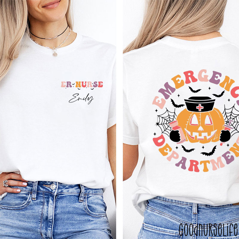 Personalized Spooky Pumpkin Emergency Department Nurse Two Sided T-Shirt