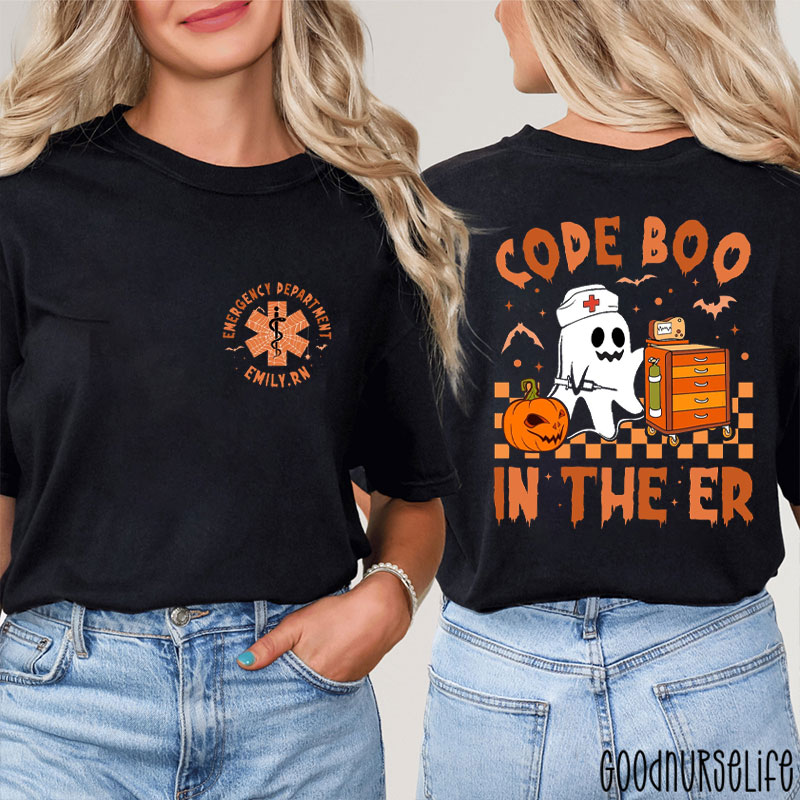 Personalized Spooky ER Code Boo With Ghost Nurse Two Sided T-Shirt