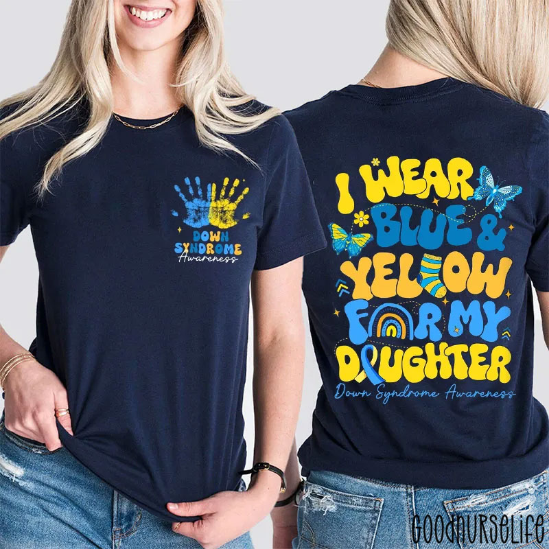 Personalized I Wear Blue Yellow Down Syndrome Awareness Nurse Two Sided T-Shirt