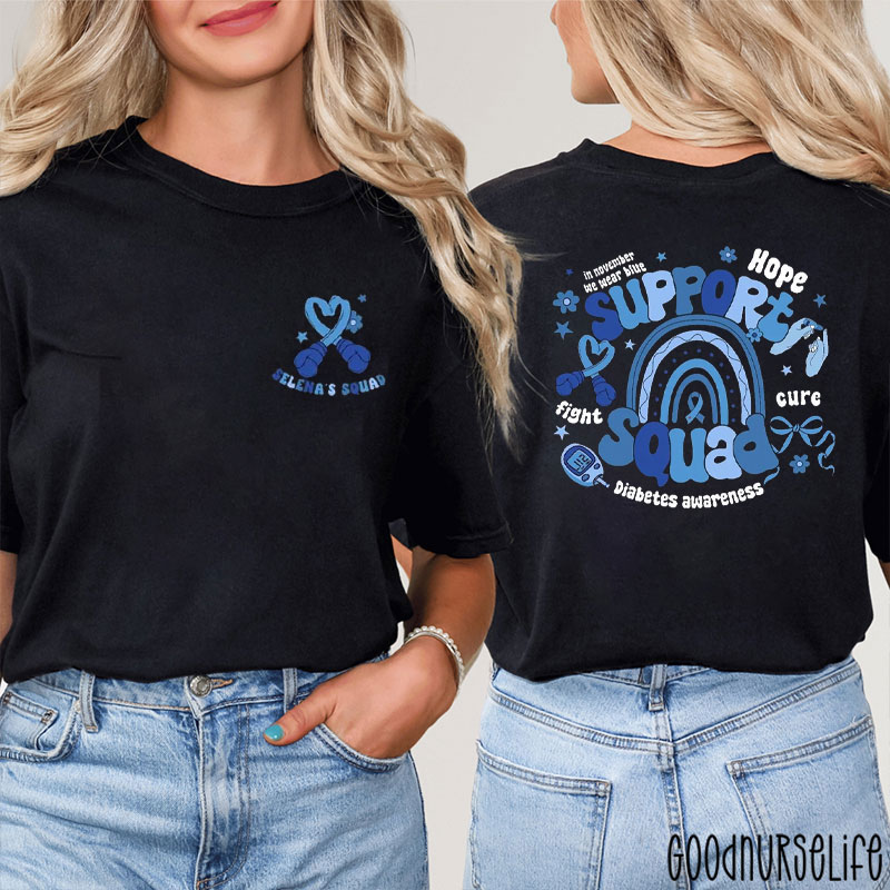 Personalized Support Squad Diabetes Awareness Blue Rainbow Nurse Two Sided T-Shirt