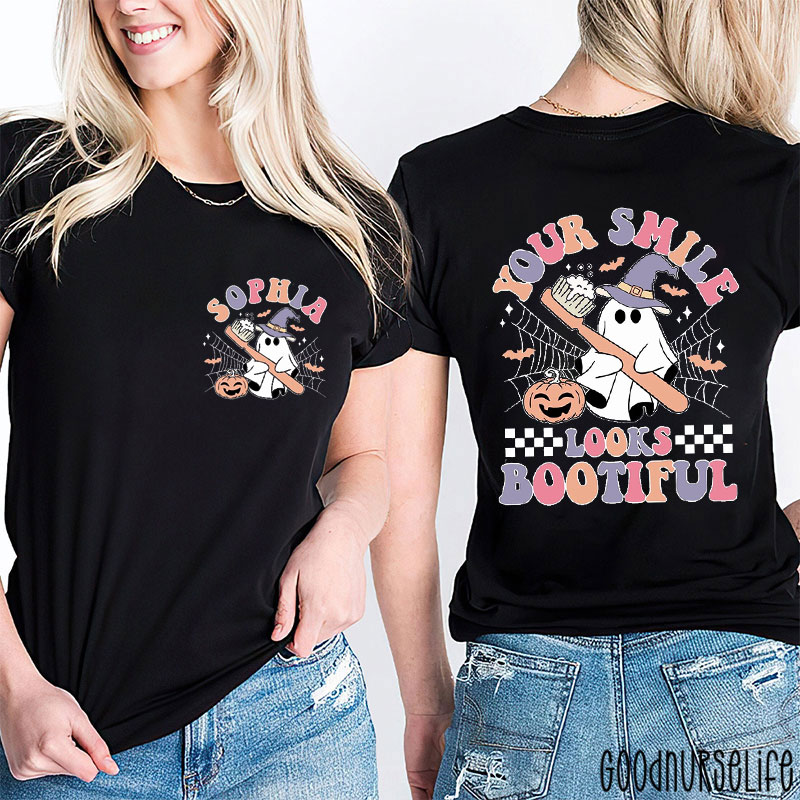 Personalized Your Smile Looks Bootiful Halloween Dental Ghost Two Sided T-Shirt