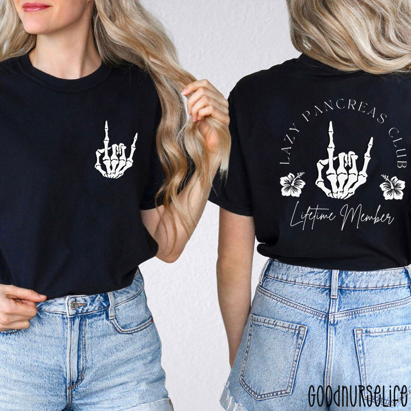 Lazy Pancreas Club Lifetime Member Skeleton Hand Nurse Two Sided T-Shirt