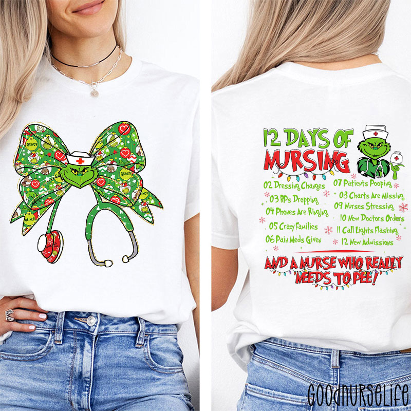 Nursing Holiday Christmas 12 Days Of Nursing Nurse Two Sided T-Shirt