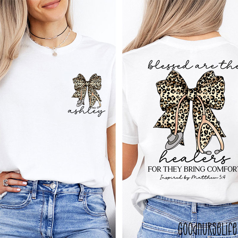Personalized Leopard Bow Tie Blessed Are The Healers For They Bring Comfort Two Sided T-Shirt