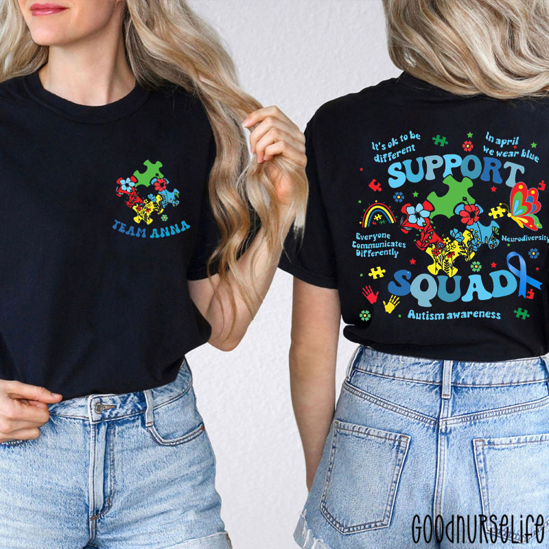 Personalized Team Name Autism Awareness Support Squad Two Sided T-Shirt