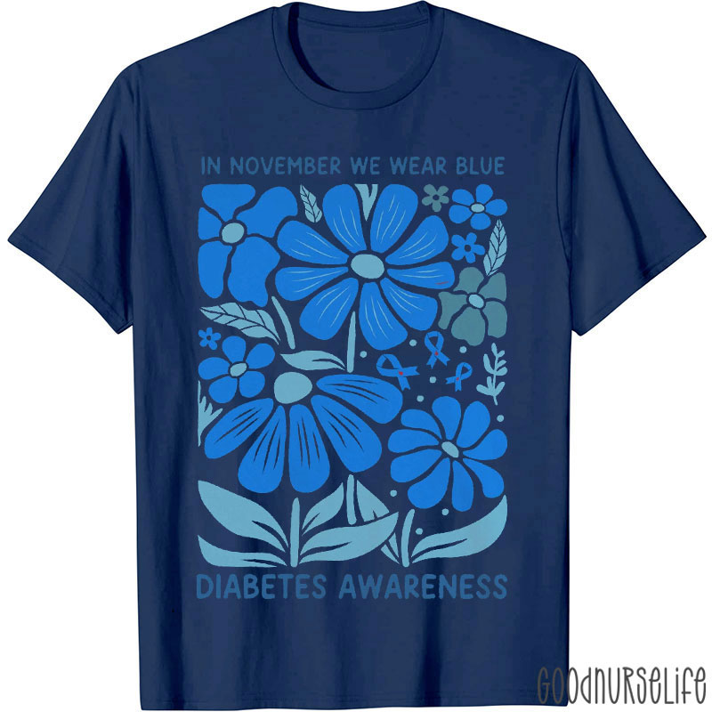 In November We Wear Blue Floral Diabetes Awareness Nurse Two Sided T-Shirt