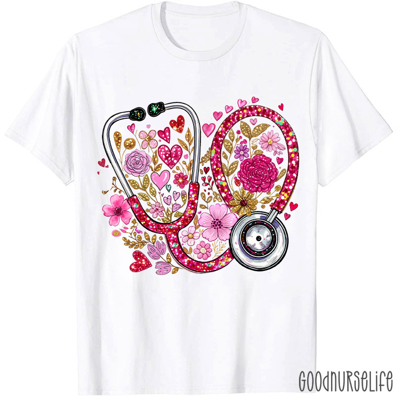 Faux Glitter Floral Stethoscope Nurse T-shirt