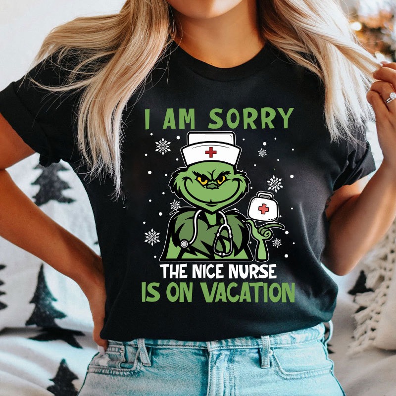The “I Am Sorry The Nice Nurse Is On Vacation” T‑shirt captures this truth with the perfect mix of sass and self‑awareness. Featuring a cheeky Grinch‑inspired nurse character front and center, the design playfully says what every nurse has thought at least once after back-to-back twelve-hour shifts: the “nice” version of me is off‑duty — proceed with caution!