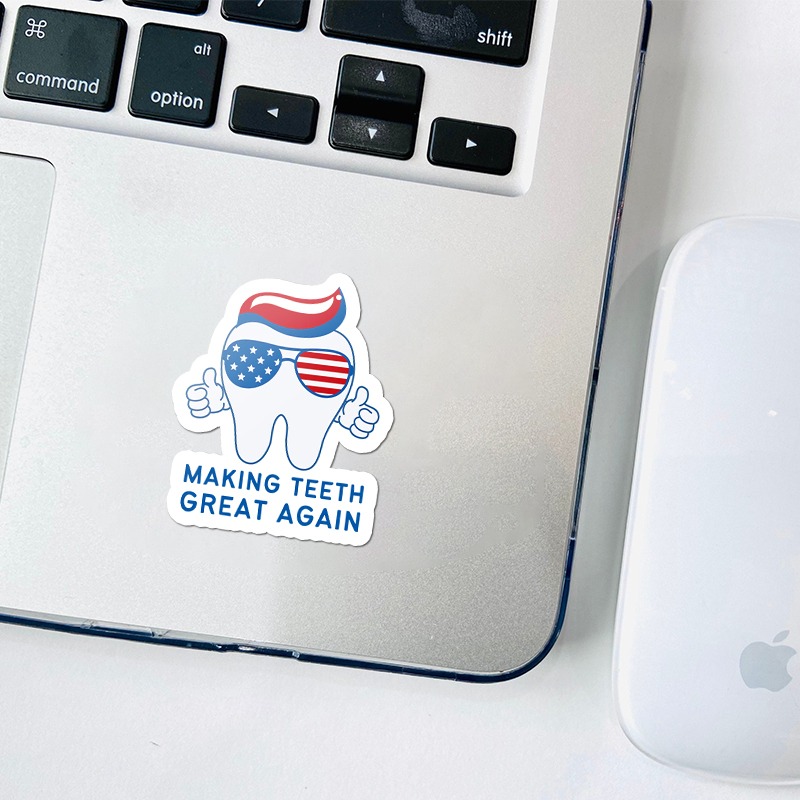 Nurses working in dental or surgical fields are obsessed with this sticker. Featuring a quirky cartoon tooth wearing American flag glasses and styled hair, the phrase “Making Teeth Great Again” is a cheeky nod to both national pride and professional pride.