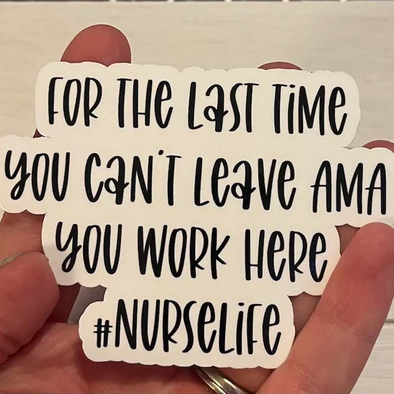 If you’ve ever wanted to say this to your coworkers out loud, now you don’t have to. This sticker boldly states: “For the last time, you can’t leave AMA—you work here. #NurseLife.” It's raw, real, and ridiculously funny.