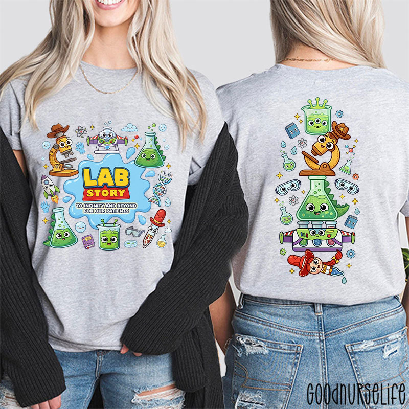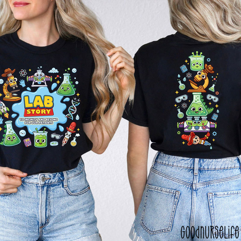The first thing you’ll notice about the Lab Week 2026 Lab Team T‑Shirt is its bold, colorful cartoon artwork. On the front, the eye‑catching “LAB STORY” logo immediately draws you in — it’s a fun nod to the idea that what happens in the lab is its own epic adventure. Underneath, the playful tagline “To Infinity and Beyond… for our patients!” reminds everyone of the dedication lab professionals bring to their work every day.