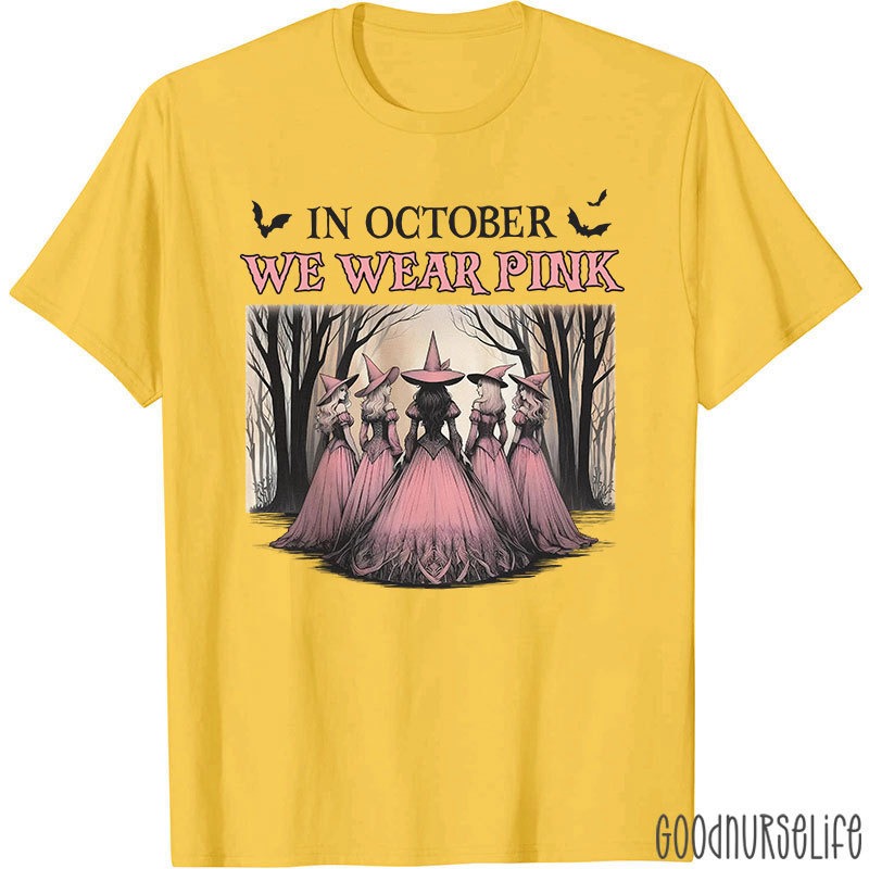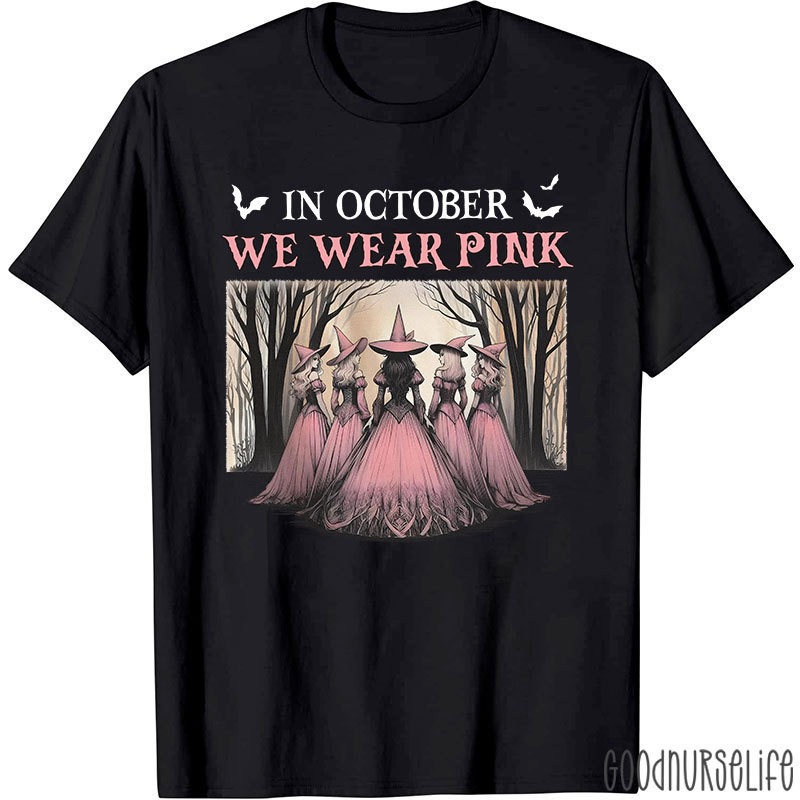 The significance of the phrase "We Wear Pink" in October extends beyond fashion. October is recognized worldwide as Breast Cancer Awareness Month, and pink has become symbolic of collective support for awareness and solidarity. The October Pink Witches Nurse T-Shirt captures this important message, cleverly infusing it into a fun seasonal motif. For nurses—who are often at the frontline of health care—wearing this tee is not only a style statement but also a testament to the causes they champion and the empathy they practice daily.