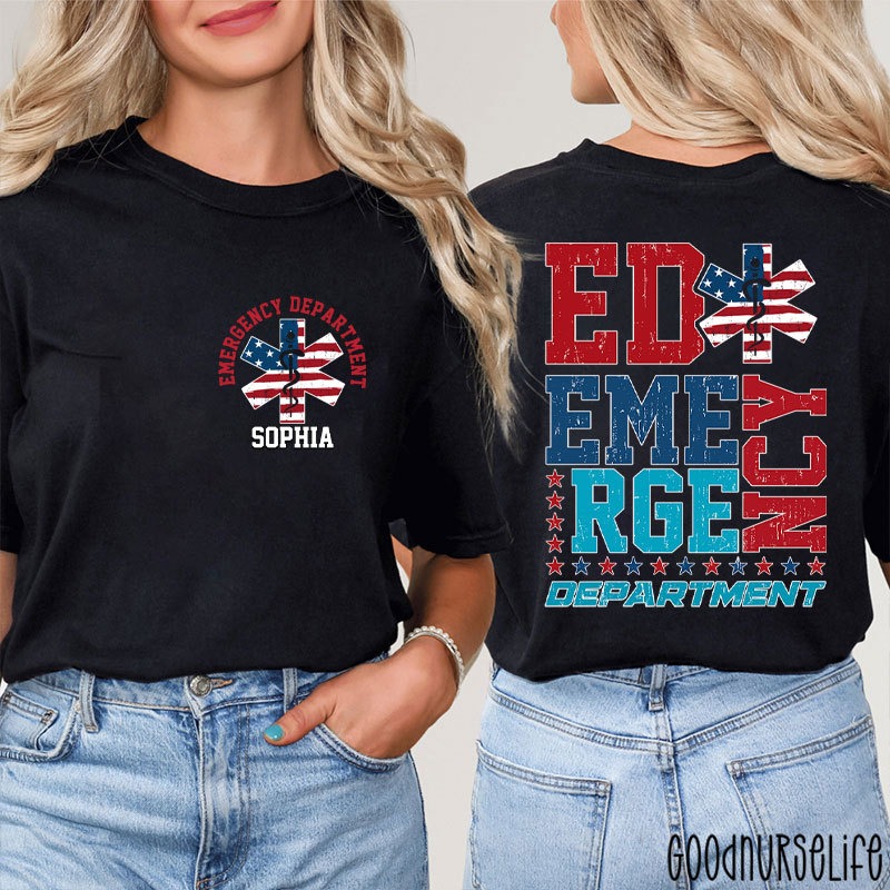 Visit GoodNurseLife.com today to grab your Personalized ED Nurse Two Sided T-Shirt on sale. Customize it with your name, pick your size, and enjoy the perfect blend of comfort, style, and patriotism.