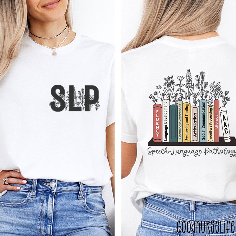 This design is a perfect blend of elegance and purpose. The front features a bold “SLP” graphic adorned with delicate floral accents, while the back showcases a beautifully illustrated bookshelf filled with speech therapy essentials like fluency, language development, and AAC. It’s a visual representation of the dedication and expertise that SLPs bring to their field.