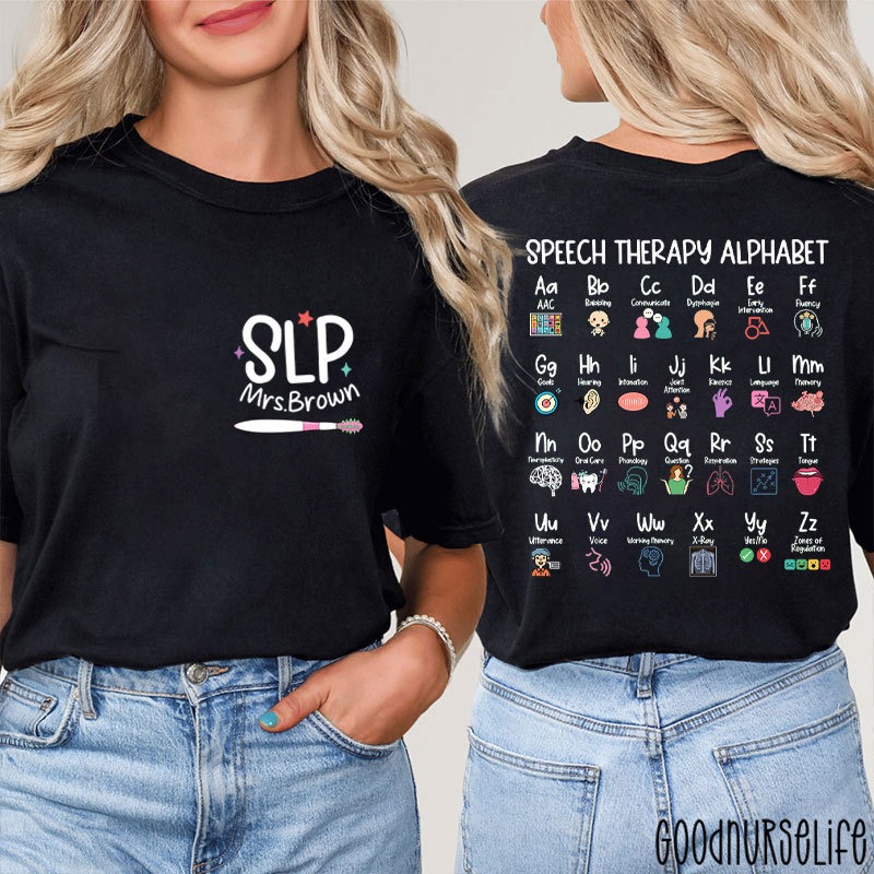 If you’re looking for a shirt that’s both playful and meaningful, this design is for you. The front features a charming “SLP” graphic with personalized options (like adding your name), while the back showcases a colorful and creative speech therapy alphabet. Each letter is paired with a fun visual, making it as educational as it is stylish.